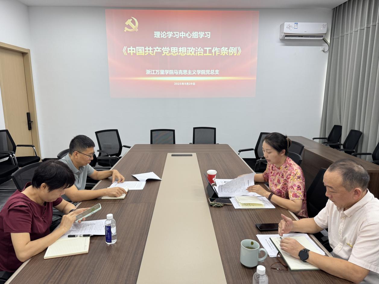 2025 年9月 29 日,马克思主义学院党总支理论学习中心组召开专题学习会,深入学习领会《中国共产党思想政治工作条例》(以下简称《条例》)精神,传达中央关于思想政治工作的重要部署要求,结合本单位工作实际研究贯彻落实举措,党总支副书记孙叶飞领学,全体理论学习中心组成员参会。