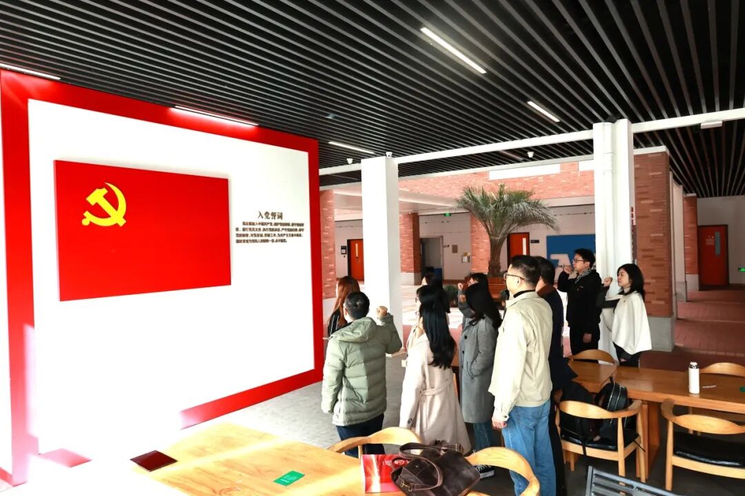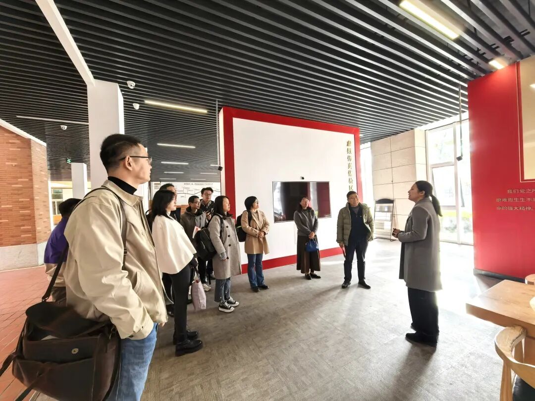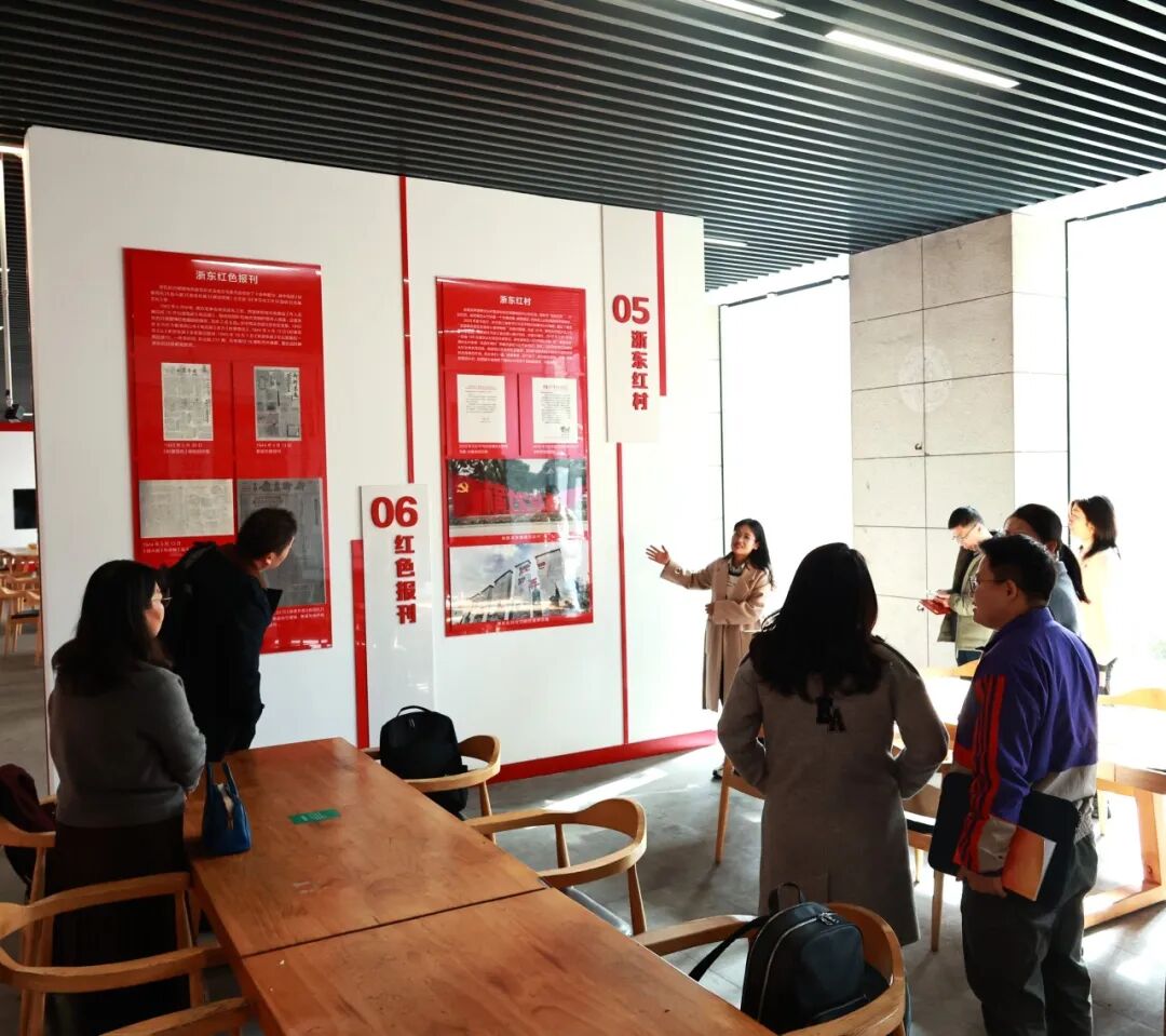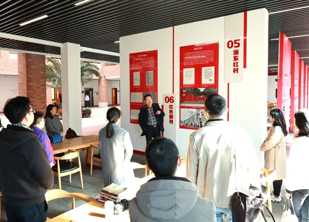 随后,支部党员教师们一同前往位于我校1号教学楼下的“初心长廊”,重温中国共产党人精神谱系与浙东红色抗战历史。党总支副书记、副院长孙叶飞系统介绍了“初心长廊”的建设背景,表示通过虚拟仿真思政课体验中心,万里学子可以沉浸式体验先辈们的革命事迹,红色基因得以代代相传,“初心不改”的共产党人的决心将更加坚定;党员教师汪敏倩挖掘地方红色资源,对“红色浙东”板块进行了讲解;支部组织委员董广军、党员教师陈金波对四明山脱贫致富的红色资源建设相关内容作了相应讲解和补充。