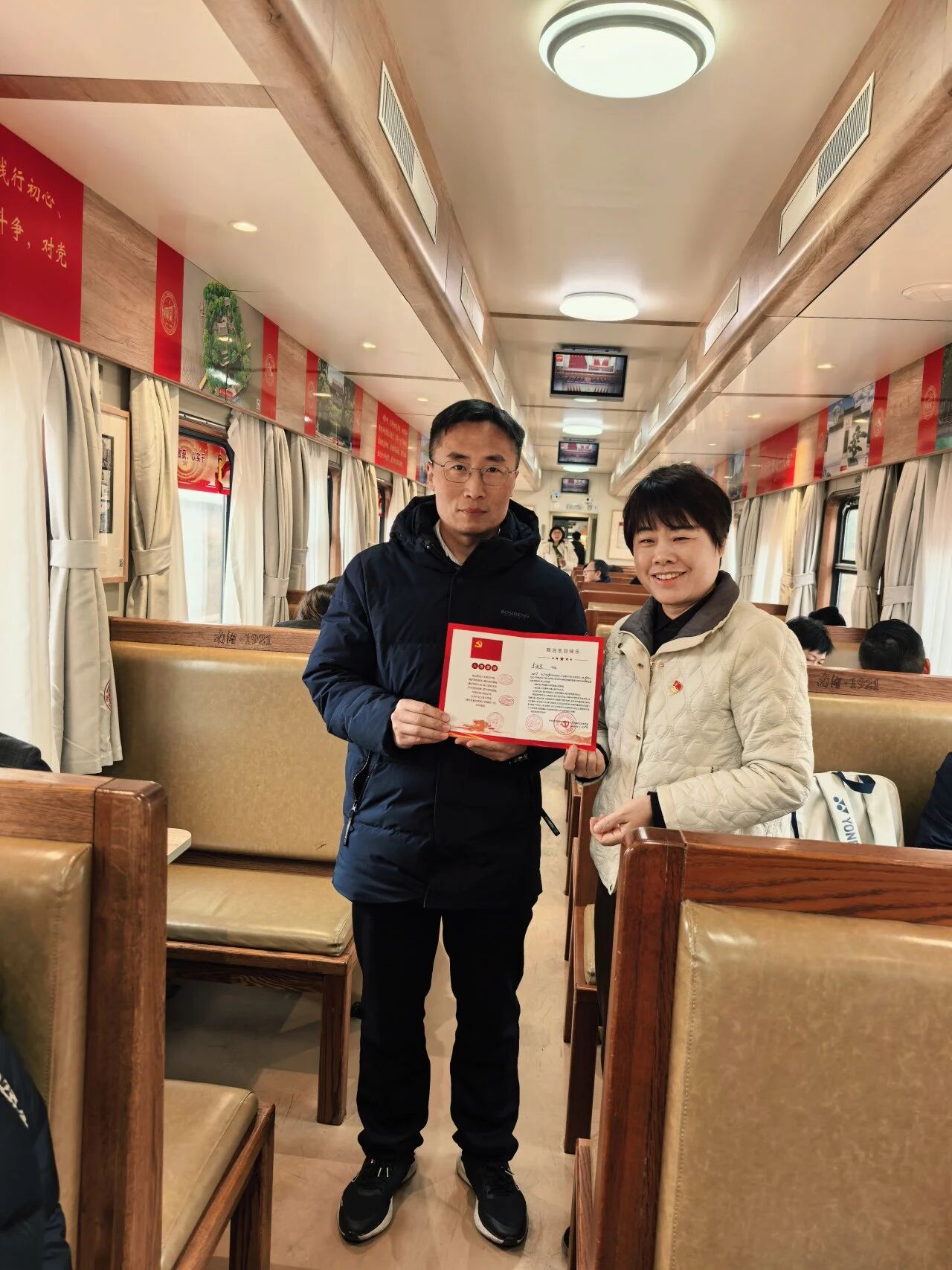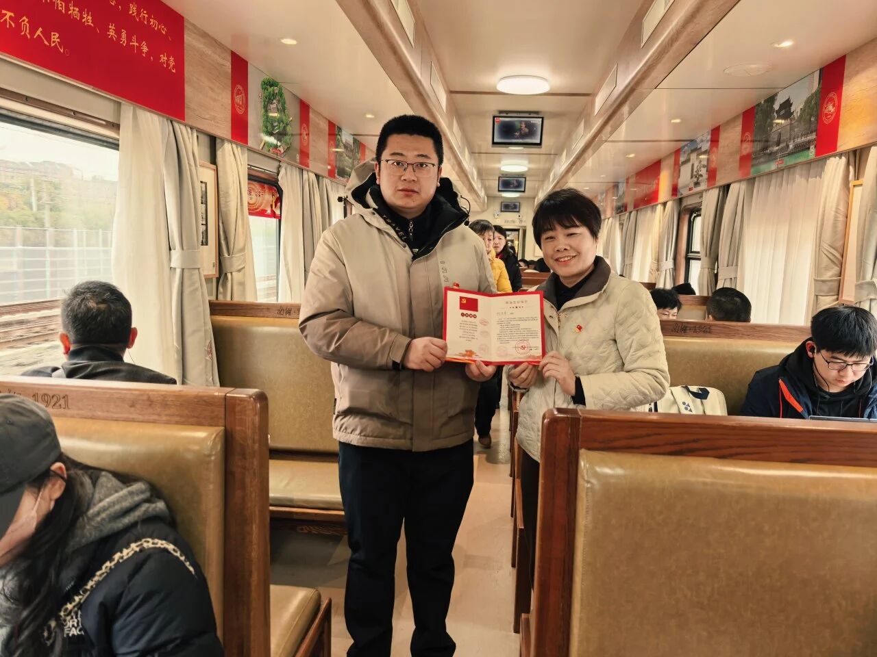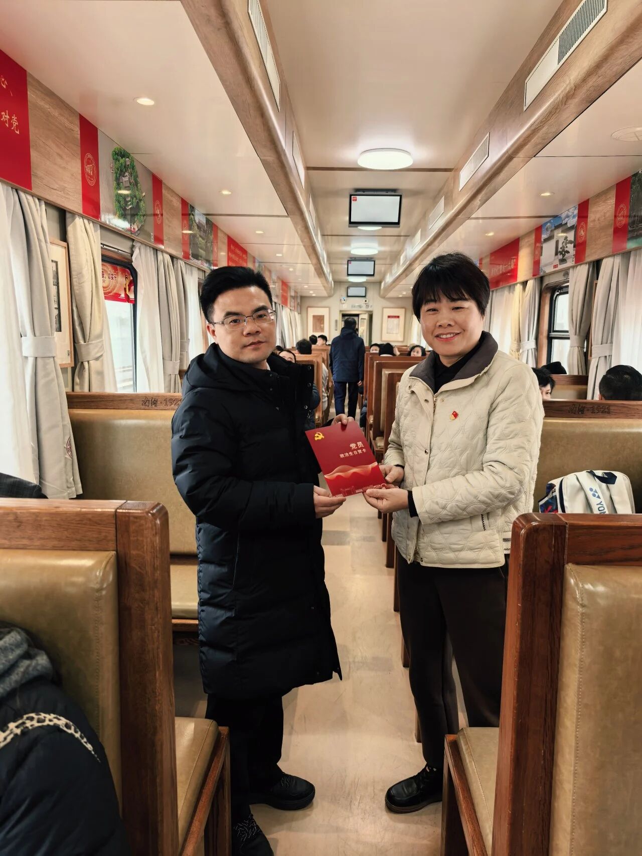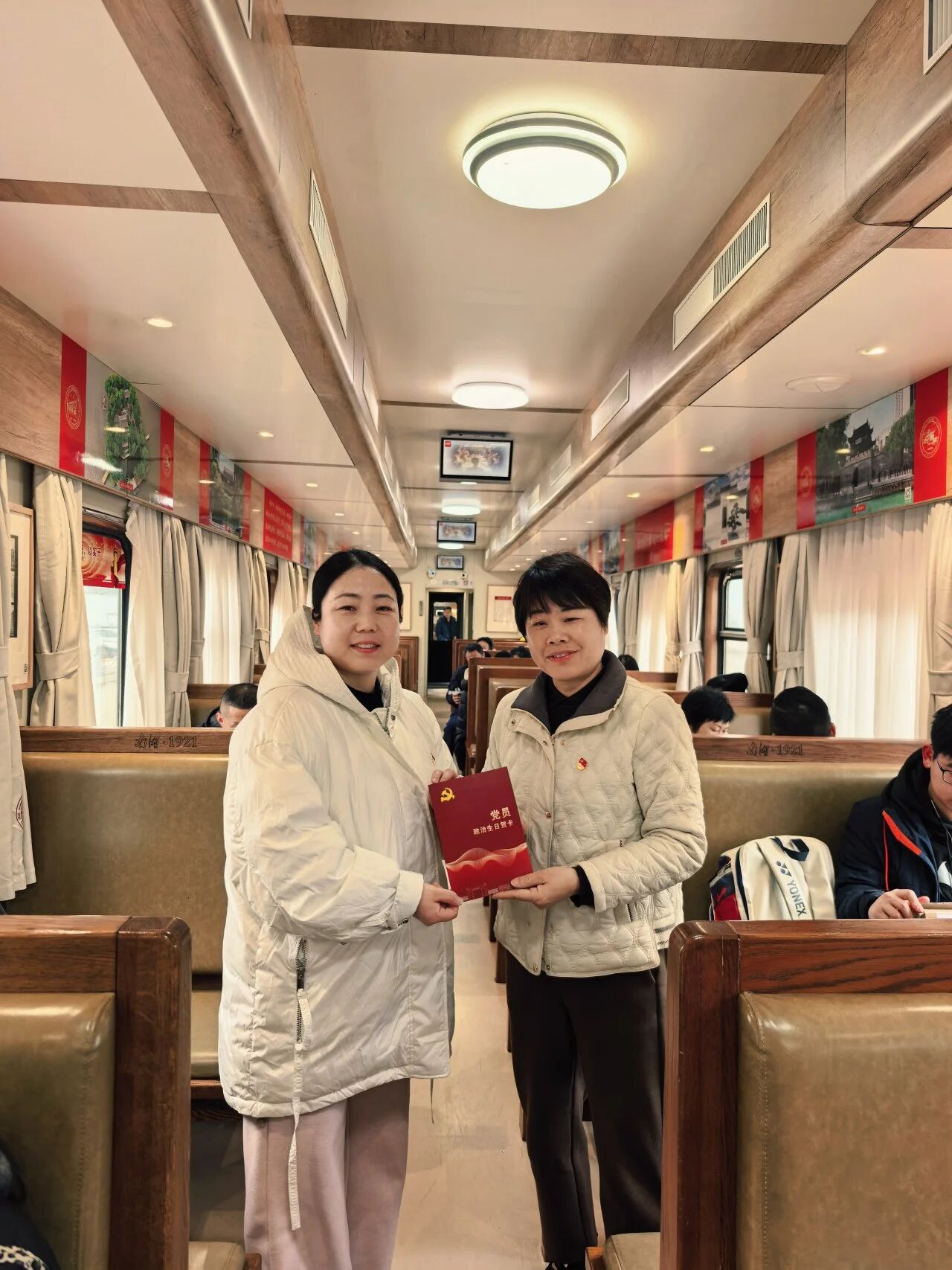 1 月 25 日,研学团队乘坐 “周恩来号” 列车从上海奔赴嘉兴,延续红色研学之旅。列车上,一场温馨而有意义的 “政治生日” 庆祝活动如期举行,全体党员为上半年入党的同志送上真挚祝福。一张生日贺卡、一句殷切寄语,既是对党员政治生命的珍视,更是对初心使命的重申与践行。大家纷纷表示,在新时代“重走一大路” 的特殊行程中过“政治生日”,意义非凡,将永远铭记这份荣耀与责任,在教书育人的岗位上永葆党员本色。