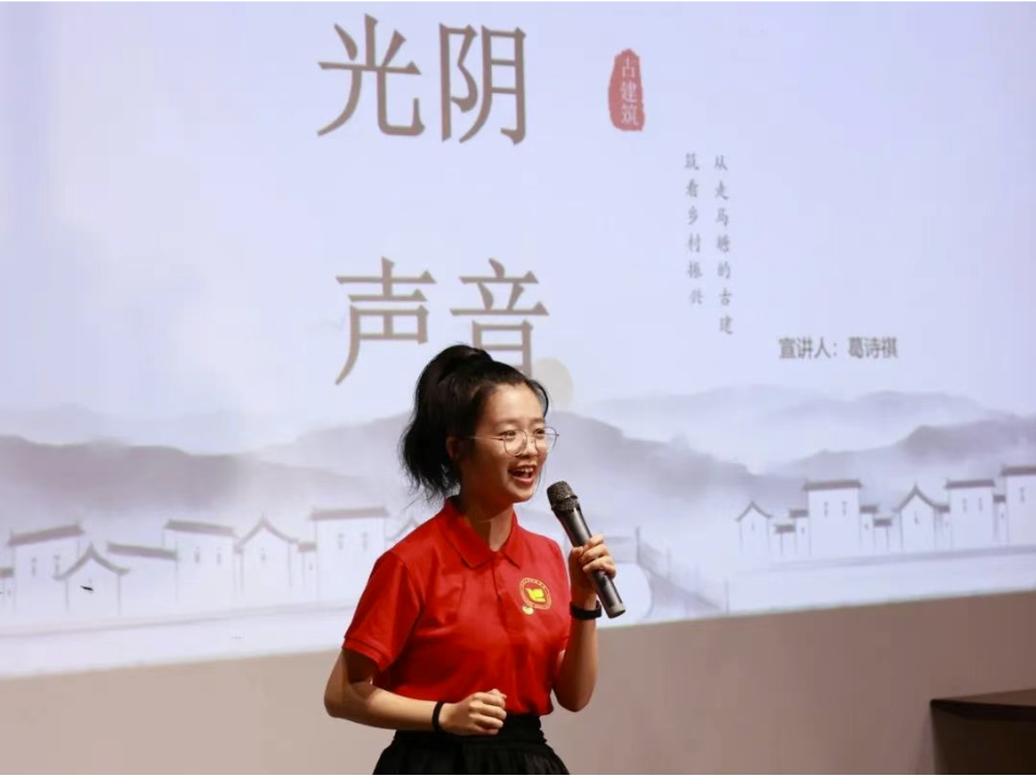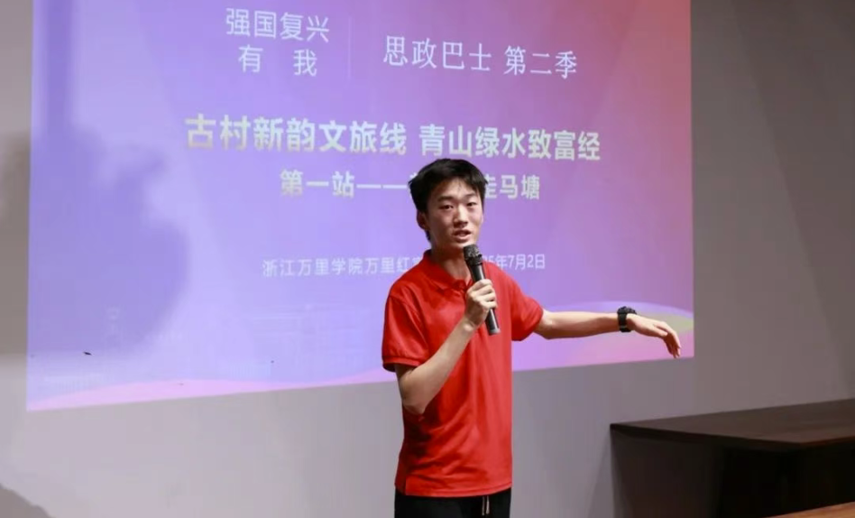 荷塘碧波荡漾,古宅青砖黛瓦。思政大巴活动的第一站,来到了姜山镇走马塘村,在村讲解员与大学生志愿者的引领下,学生们首先参观了村中景物,了解了“中国进士第一村”名称的由来;在乡村振兴大讲堂里,孟晓老师与“万里红”宣讲团的宣讲员们则以生动的语言、活泼的形式呈现了一场别具一格的思政课堂,带领学生们真正走进绿水青山的世界。