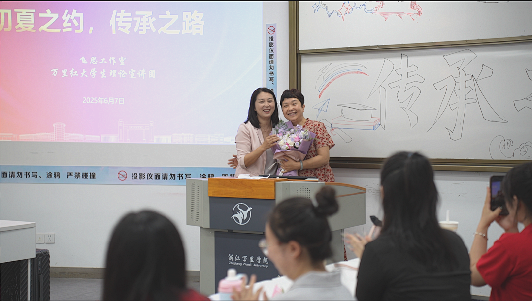 宣讲团创始老师孙叶飞,为宣讲团指导老师吴萍鲜献上鲜花,“这不仅是感恩之花,更是传承之花”,吴老师难掩感动,在即将荣休之际寄语飞思及宣讲团未来发展。