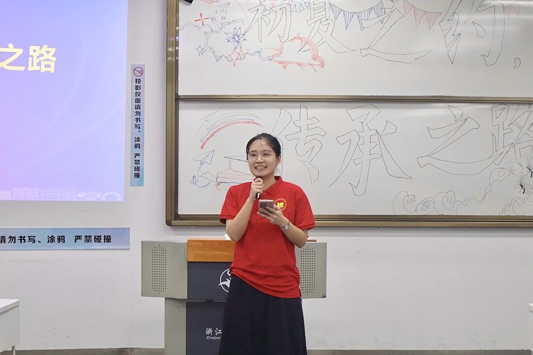 第四届宣讲团团长、2020级学姐张静雯,在校期间曾代表宣讲团参加宁波市大中小学一体化活动,带领宣讲团走过了转型之路。她说,要培养自己处理突发情况的能力,不畏惧突然来临的东西,要坚信自己能解决它们。