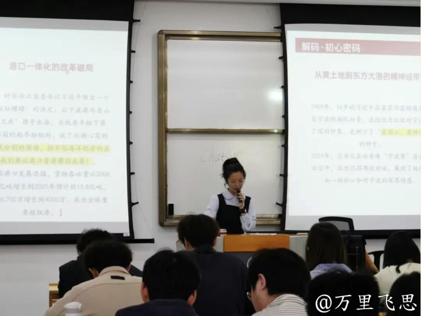 宣讲员王之懿以游戏打开属于青年人的思政课,用“四重关卡”解码今年两会热词,通过国产AI大模型DeepSeek的技术突围、宁波机床厂数据进化打造智能工厂等案例,让长期主义的概念不再抽象,使同学们切身感受到“国家战略的制定和推进更需要发育、坚持和团队协作!”